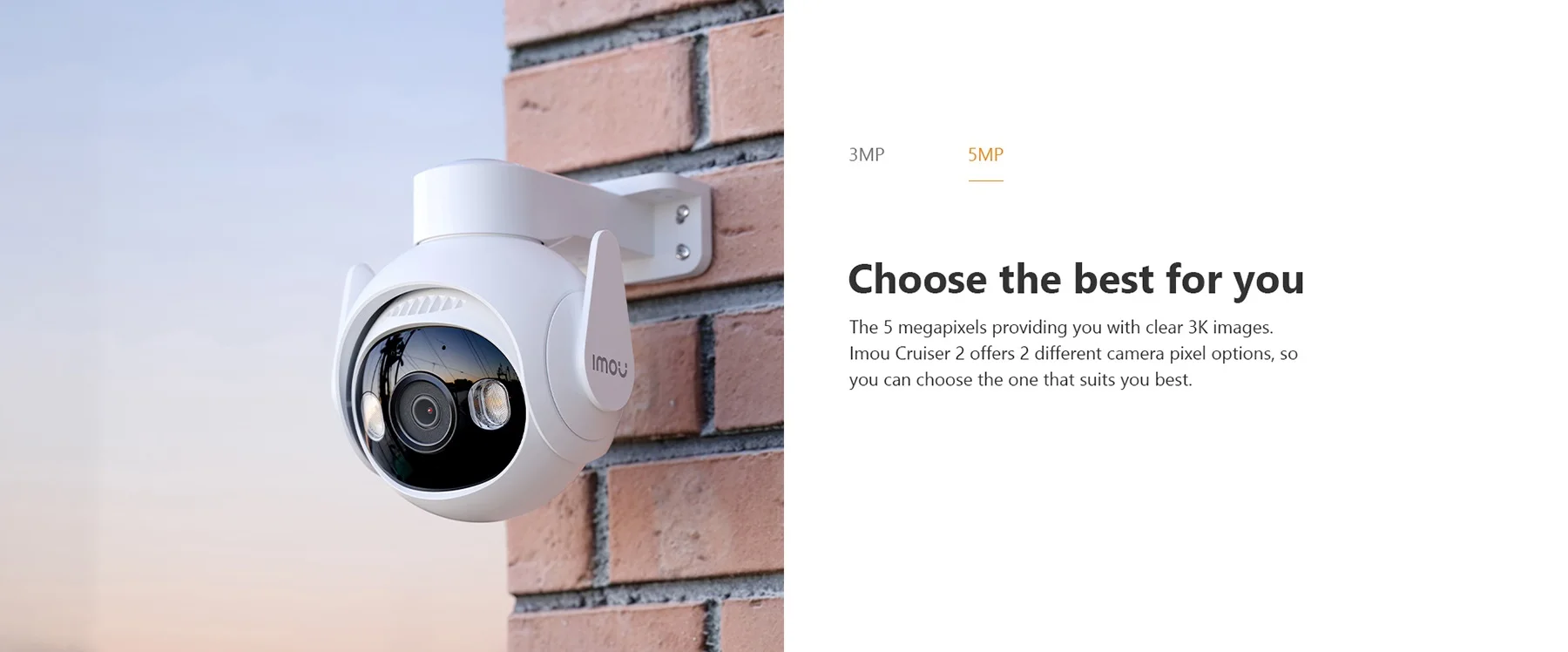 Les 5 mégapixels vous offrent des images 3K claires. Imou Cruiser 2 offre 2 options de pixels d’appareil photo différentes, vous pouvez donc choisir celle qui vous convient le mieux.